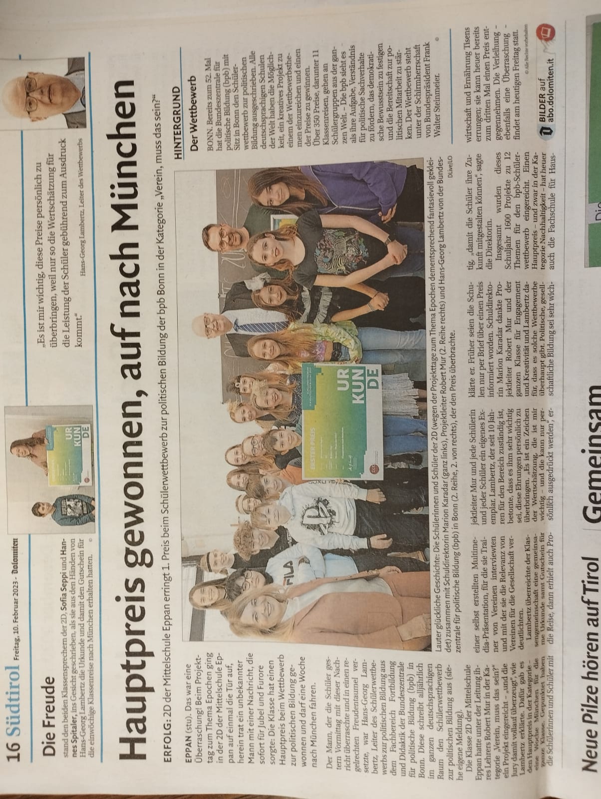 Die Klasse 2D der Mittelschule Eppan gewinnt den 1. Preis beim Schülerwettbewerb zur politischen Bildung der bpb Bonn. In der Kategorie „Verein, muss das sein?“ hatten die Schüler*innen der Klasse 2D unter der Leitung ihres Lehrers Robert Mur ein Projekt eingereicht. „Gepunktet haben die Schülerinnen und Schüler mit einer selbst erstellten Multimedia-Präsentation, für die sie Trainer von Vereinen interviewten und mit der sie die Relevanz von Vereinen für die Gesellschaft verdeutlichten.“ (Dolomiten, 10.02.2023, S. 16)Zum gesamten Artikel geht es hier: Link (Dolomiten, 10.02.2023, S. 16)